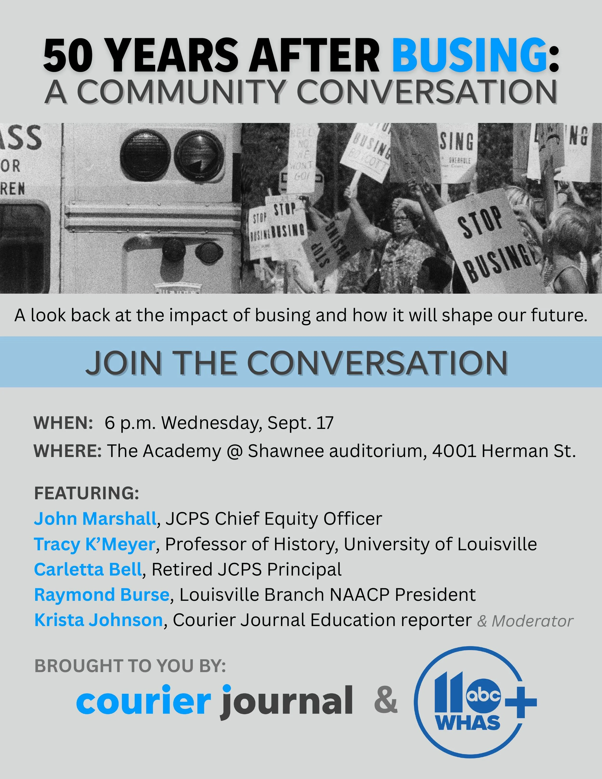 Join us for an important conversation reflecting on the 50th anniversary of busing in Louisville. Together, we’ll look back at its impact and discuss how it will shape our future.